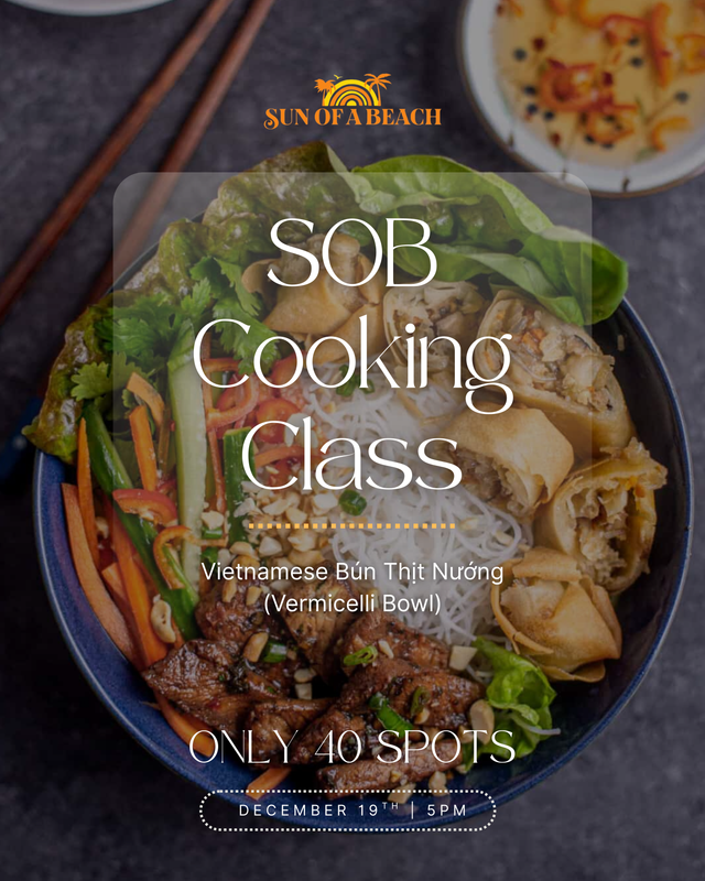 You'll build your own Vermicelli Bowl, topped with succulent home-marinated protein, and Phan's hand-rolled crispy spring rolls. Phan will guide you with tips and techniques on how to bring out the fragrant aromas that define Vietnamese cooking. You'll gain the confidence to recreate this recipe in your own kitchen and learn where to source essential Vietnamese ingredients too. Whether you're cooking alongside friends or venturing into this culinary journey solo, get ready for an unforgettable Vietnamese cooking experience that promises to be both enjoyable and delicious right here at SOB!